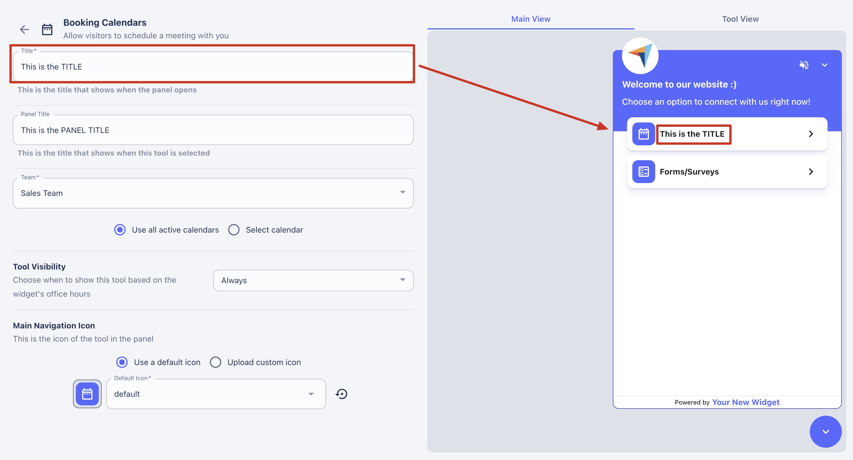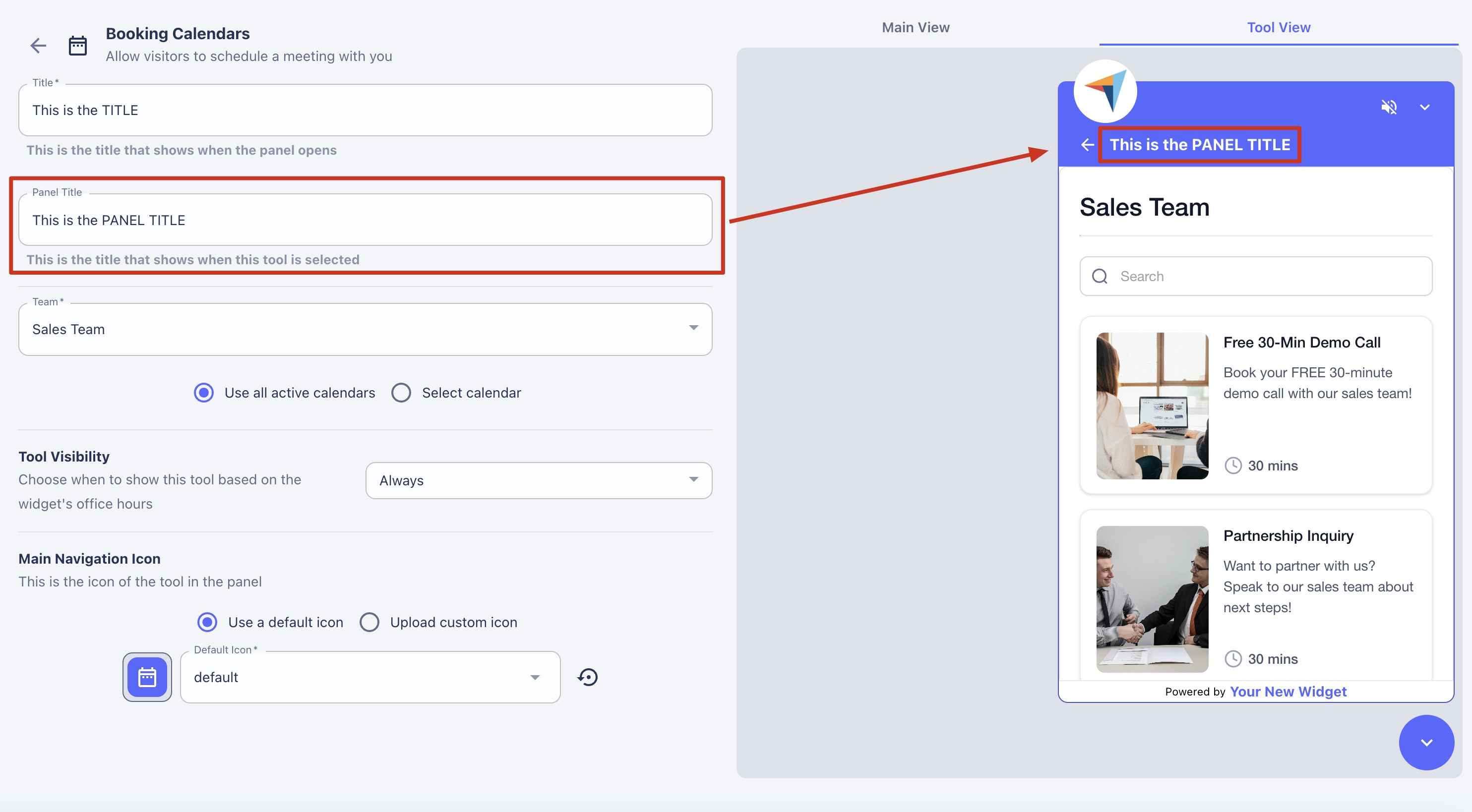 This is the title that will be displayed when the widget tool is opened inside the widget, as shown below. To change the panel title of any widget tool, simply click on the Panel Title field, and type in your preferred text.