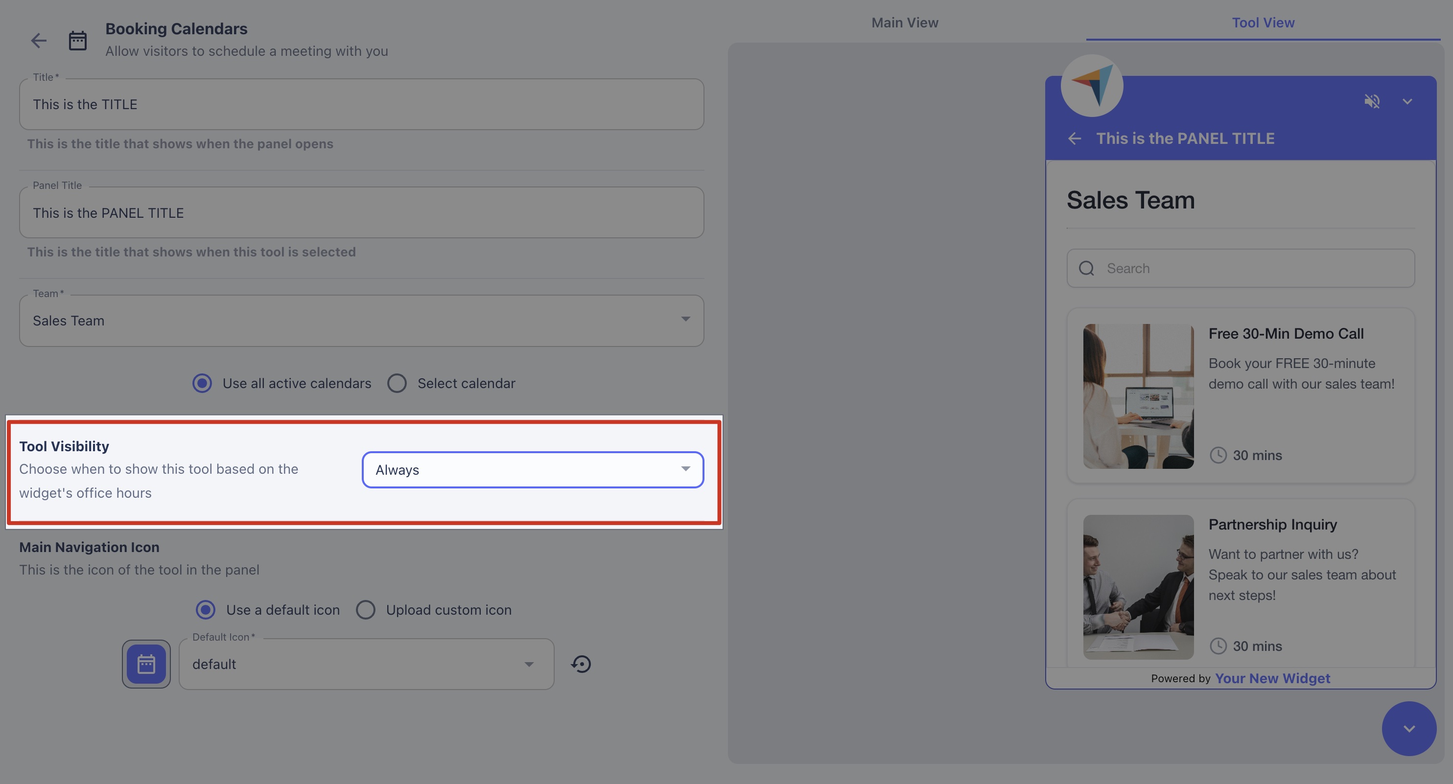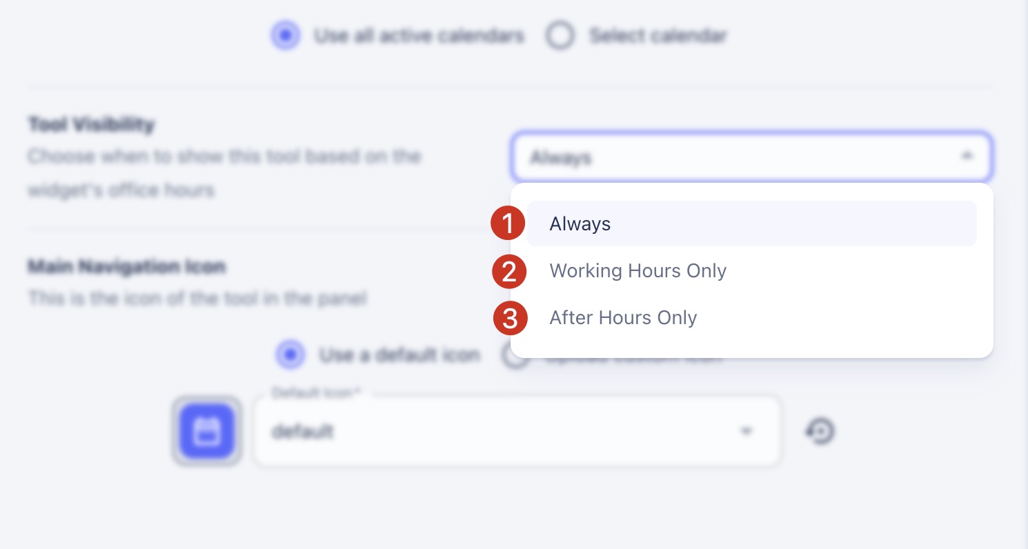 The Tool Visibility option allows you to connect individual tools to your [OFFICE HOURS](https://widgets.yourhelpcenter.net/widget-builder/office-hours) schedule. With these options, you have the flexibility to show specific Conversion Tools™ to your prospects and customers as you see fit.